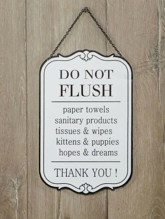 Bathroom Sign DO Not Flush Towels Wipes Puppies Hopes Dreams White Metal w Chain