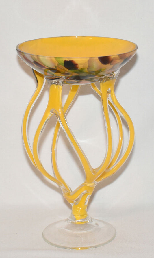 Jozefina Krosno Hand Blown Art Glass Jelly Fish Compote Yellow Cased Glass Bowl