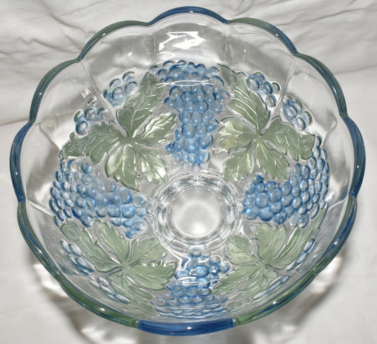 Large Vintage Crystal Bowl Embossed Paneled Grape & Leaf Colored Glass Pedestal Bowl