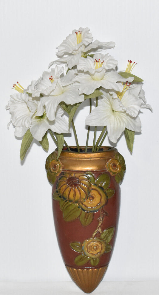 Pr Art Deco Floral Wall Pockets 8.5" Ceramic Wall Vase Brick Red w Green & Gold