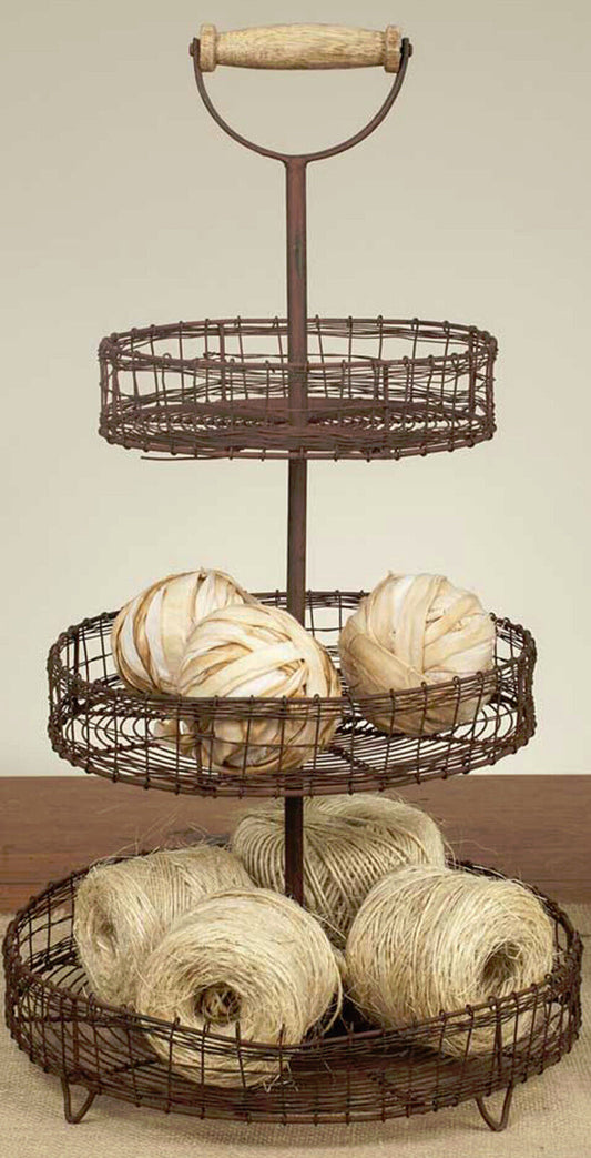 Three Tier Wire Basket Stand Display Wooden Handle Rustic Country Home Decor