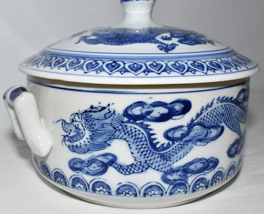 Vintage 1970s Chinese Lidded Bowl w Dragons Blue White Hand Painted Porcelain Dish