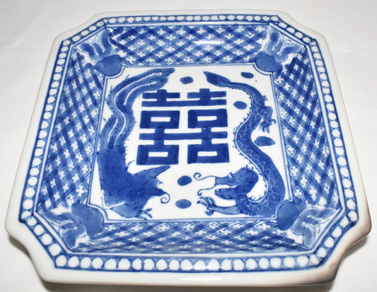 Vintage Chinese Double Happiness Plate/Bowl with Dragon Phoenix & Insects Blue White