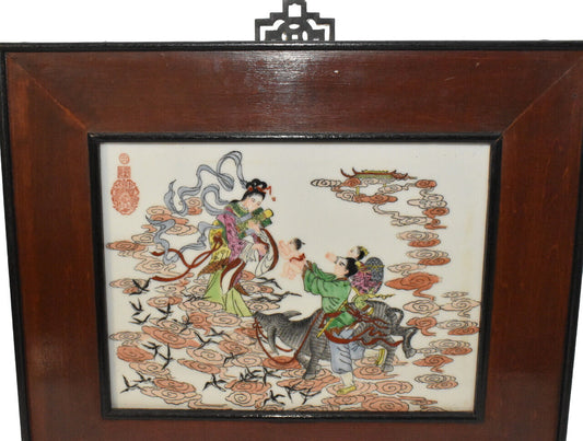 Vintage Chinese Framed Porcelain Tile Painting Hand Painted Textured Art 18" x 14.5"