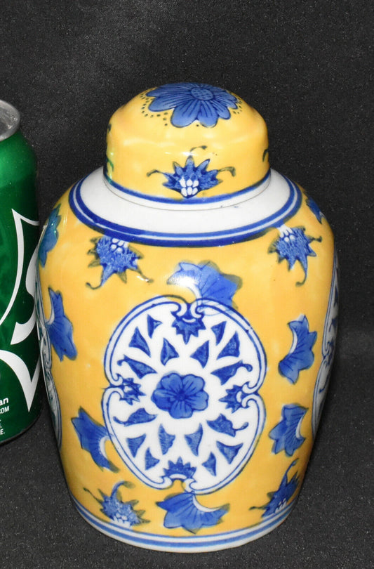 Vintage Chinese Ginger Jar 6" Yellow Blue Lidded Porcelain Jar Floral Panels Signed