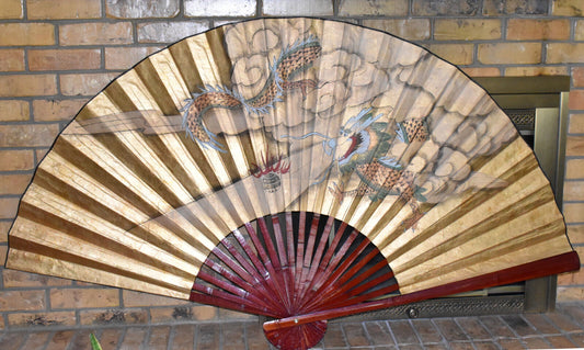 Large Vintage Chinese Dragon Fan Mid Century 70" x 40" Hand Painted Wall Fan