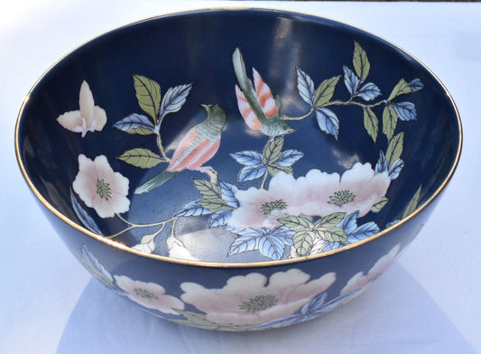 Mid/Late 20th Century Chinese 10" Blue Porcelain Bowl Hand Painted Flowers Birds