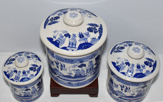 Vintage Blue Willow Transferware 3 Piece Canister Set Blue White Ceramic Canisters