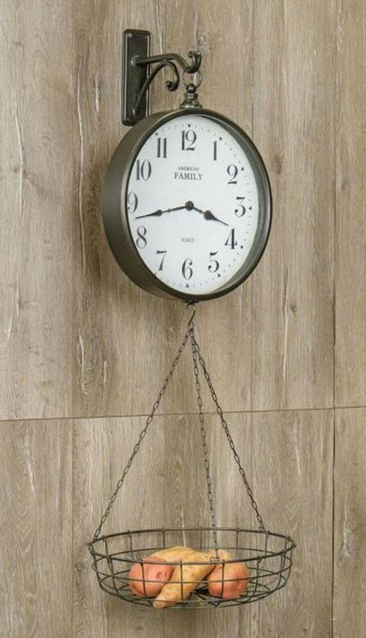 Lg General Store Scale Clock w Hanging Produce Basket Wall Hook Farmhouse Decor