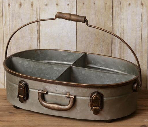 Galvanized Metal Divided Bin Caddy Carrier w Handle Suitcase Inspired Caddy