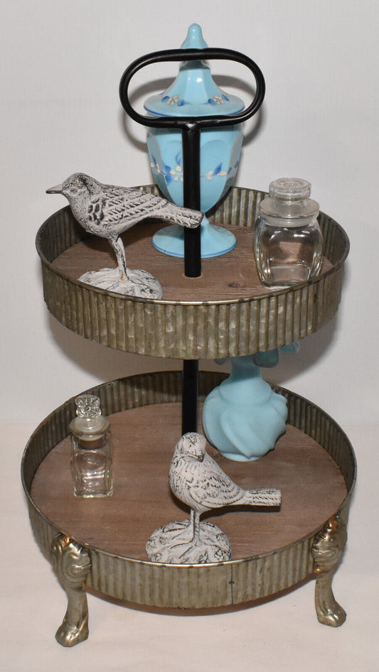 Large Two Tiered Stand Tray Footed Display Cupcakes Fruit Vanity Metal & Wood
