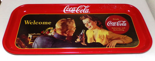 Vintage Coca Cola Tray w Marine & Lady Long 19" Red Serving Tray Org. Art 1943