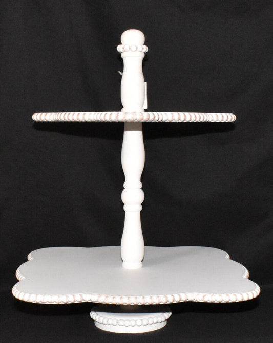 Wooden Two Tiered Stand Display Distressed White Display Tray w Beaded Trim New
