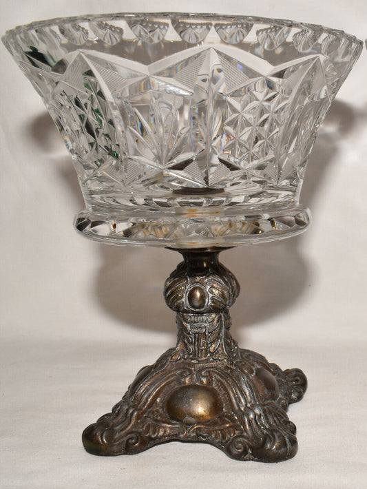 Pair American Brilliant Period Glass Compotes w Brass Base Cut Crystal Open Dish