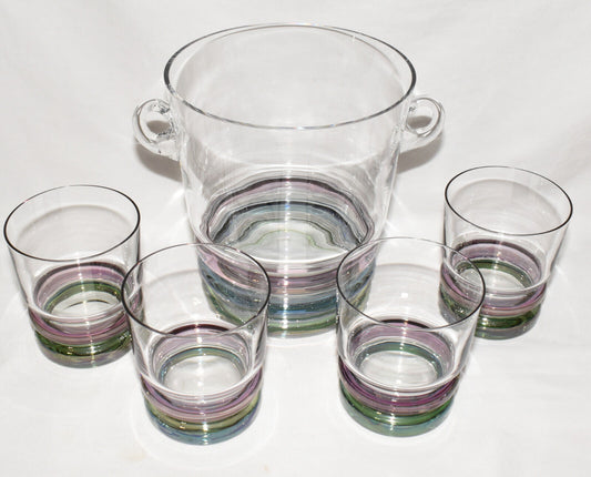 Vintage Mid Century Low Ball Glasses w Double Handled Ice Bucket 5pc Glass Bar Set
