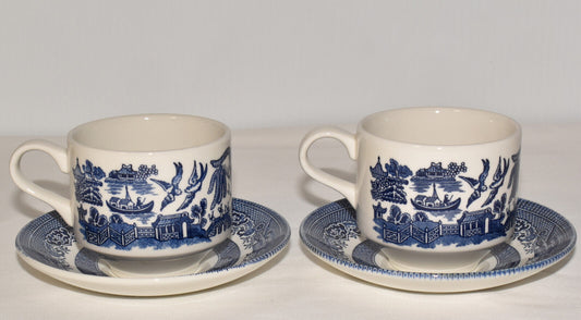 Vintage Churchill Blue Willow 4pc Teacup & Saucer Set 2 Cups 2 Saucers England