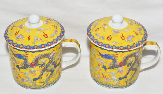 R.S.I. Chinese Dragon Mugs w Lids Pair Yellow Porcelain Tea Coffee Cups Mugs