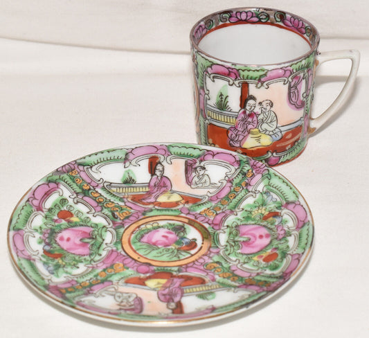 Vintage Chinese Rose Medallion Demitasse Teacup & Saucer Pink Green w Red Mark