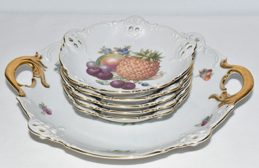 Vintage AJ Co Czech Reticulated Bowls 6pc Set Transferware Bowls w Fruit Nut Motif