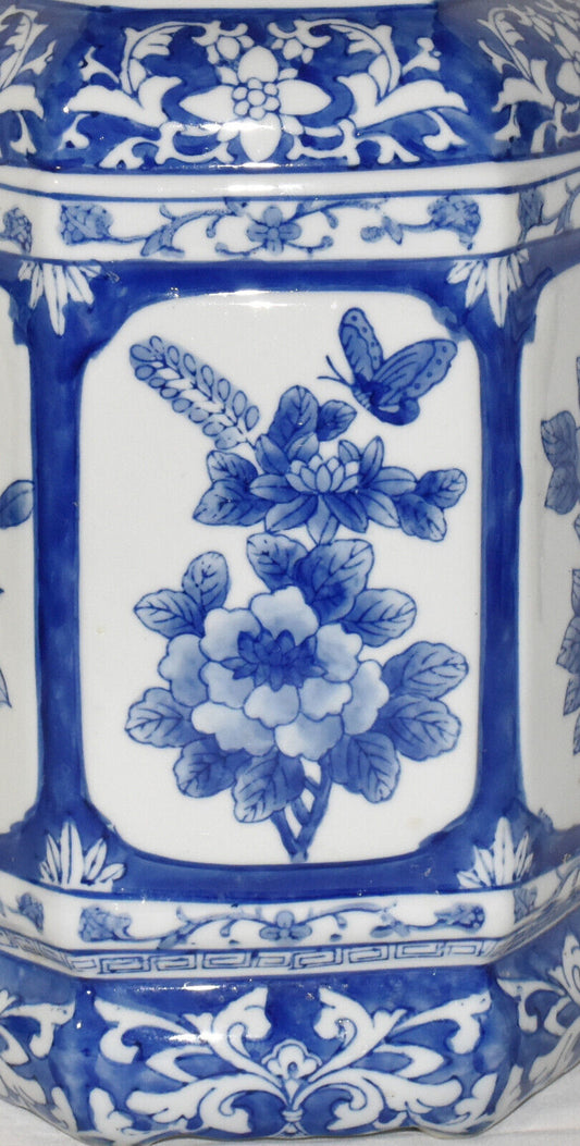 Vintage Chinese Blue White Porcelain Vase 11" Hexagon Jar w Floral & Butterfly Motif