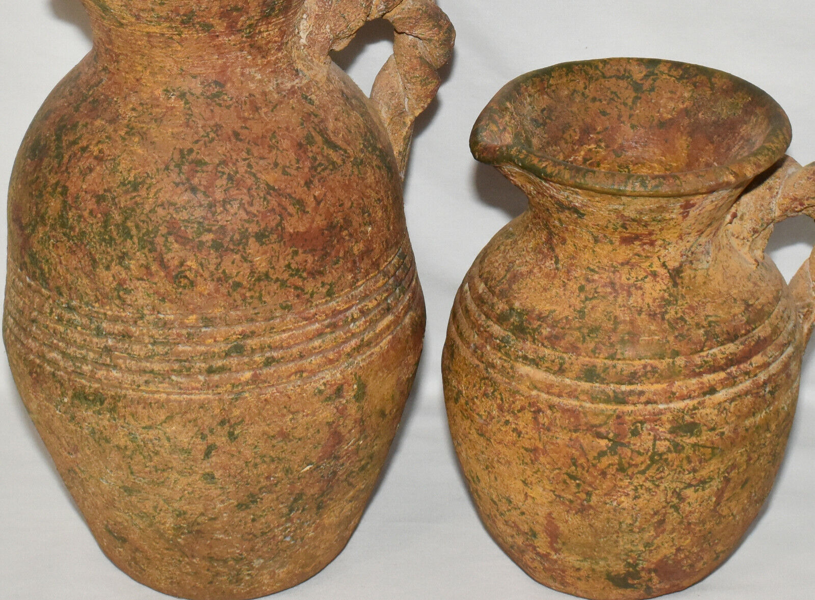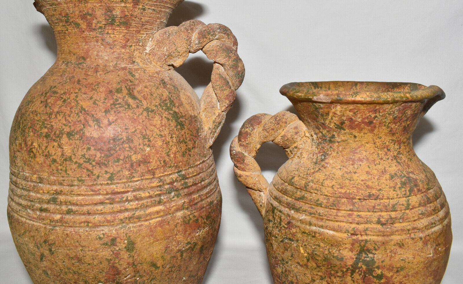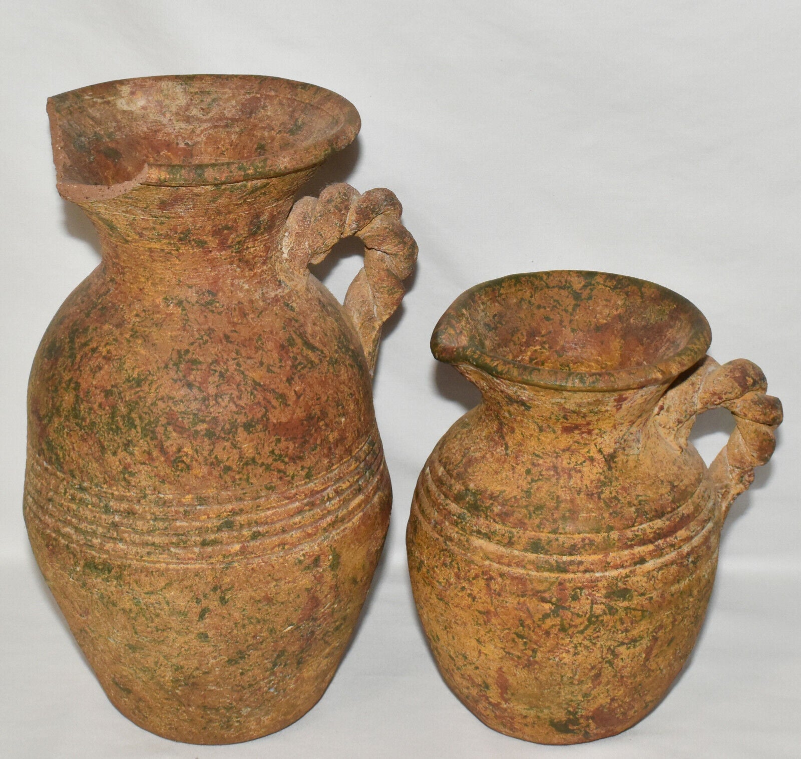 Pair Antique Terracotta Pottery Jugs Splatterware Vases Jugs w Twisted Handles
