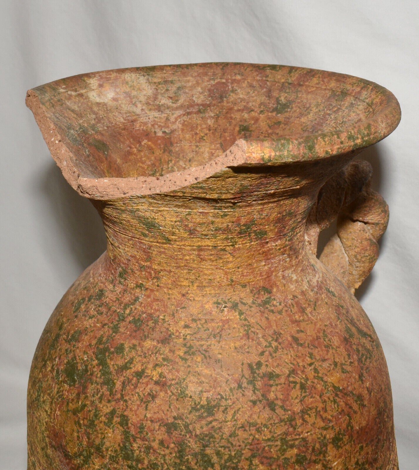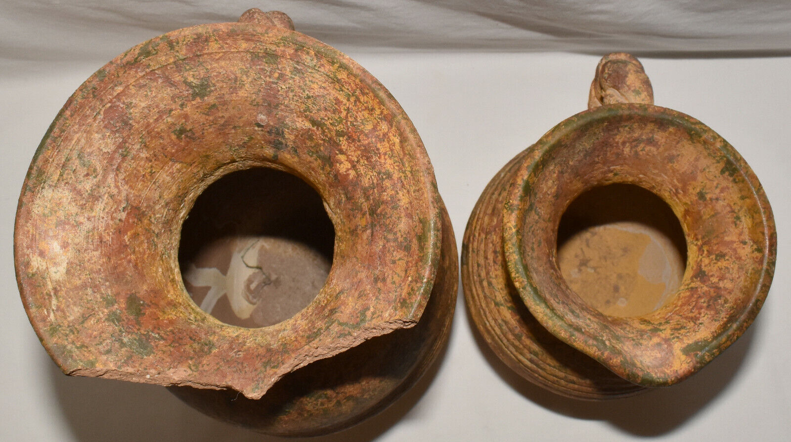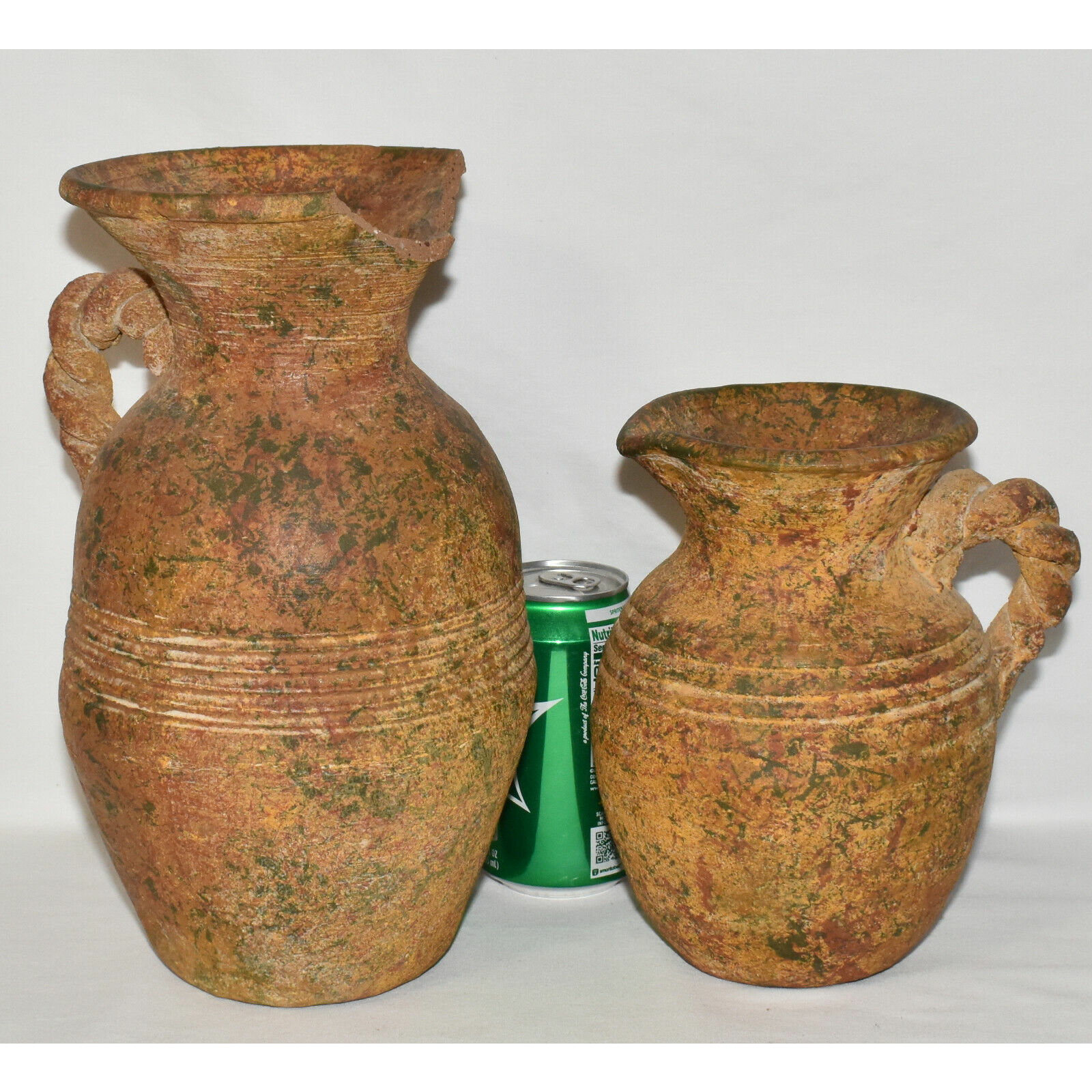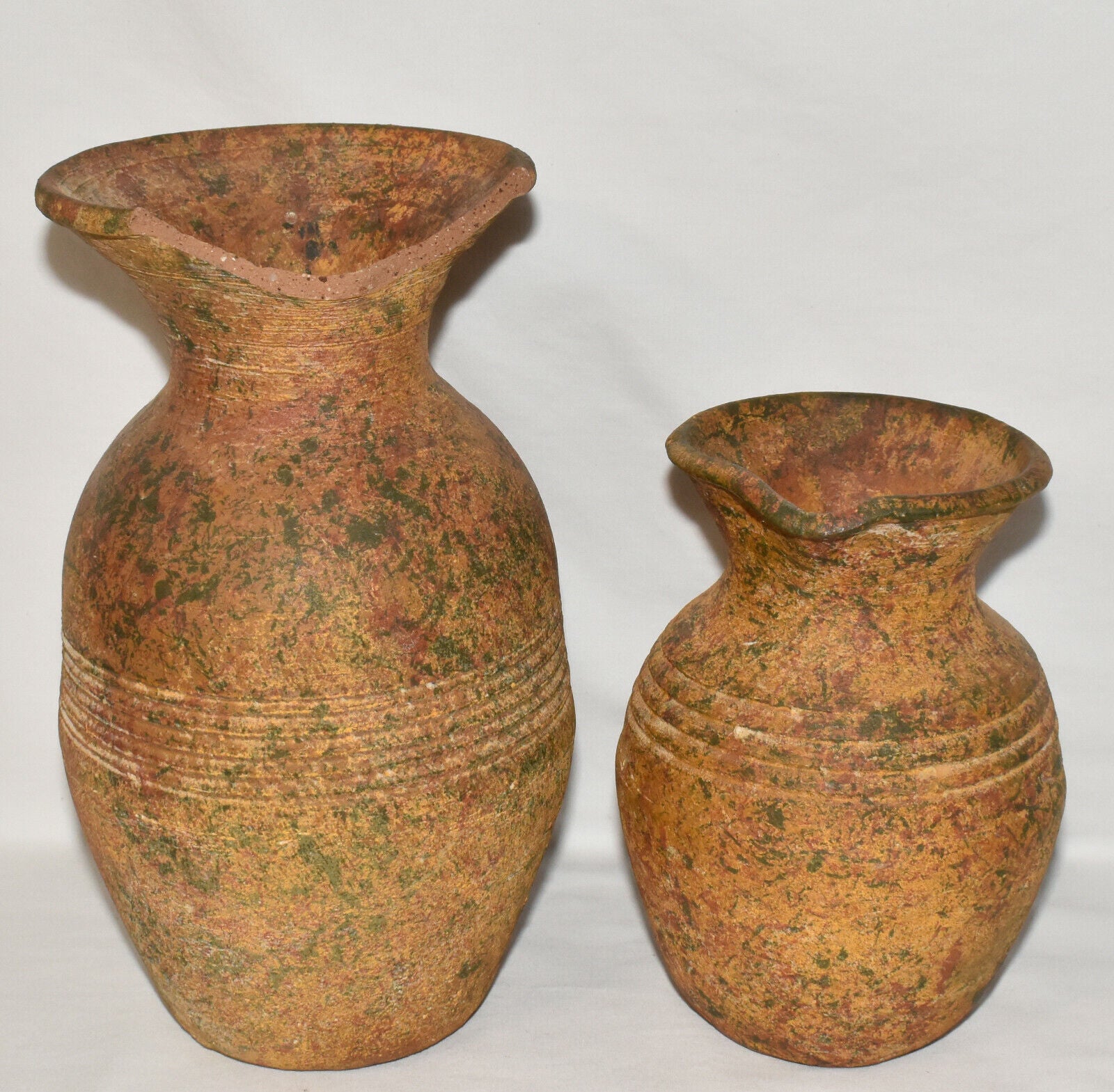 Pair Antique Terracotta Pottery Jugs Splatterware Vases Jugs w Twisted Handles